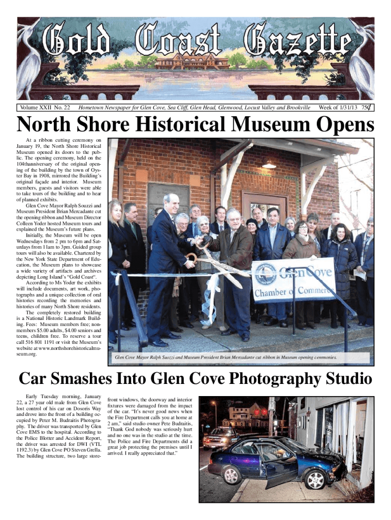 Volume XXII No. 22Hometown Newspaper for Glen Cove, Sea Cliff, Glen Head, Glenwood, Locust Valley and BrookvilleWeek of 1/31/13 75CNorth Shore Historical Museum Opens At a ribbon cutting ceremony