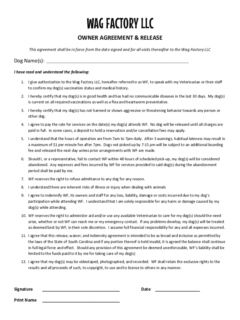 WAG FACTORY LLC OWNER AGREEMENT & RELEASE This agreement shall be in force from the date signed and for all visits thereafter to the Wag Factory Lapdog Name(s):___I have read and understand the following: