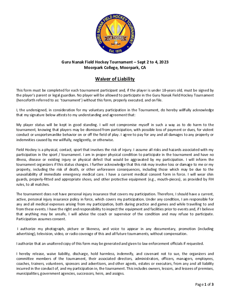 Guru Nanak Field Hockey Tournament Sept 2 to 4, 2023 Moor park College, Moor park, Waiver of Liability This form must be completed for each tournament participant and, if the player is under 18years
