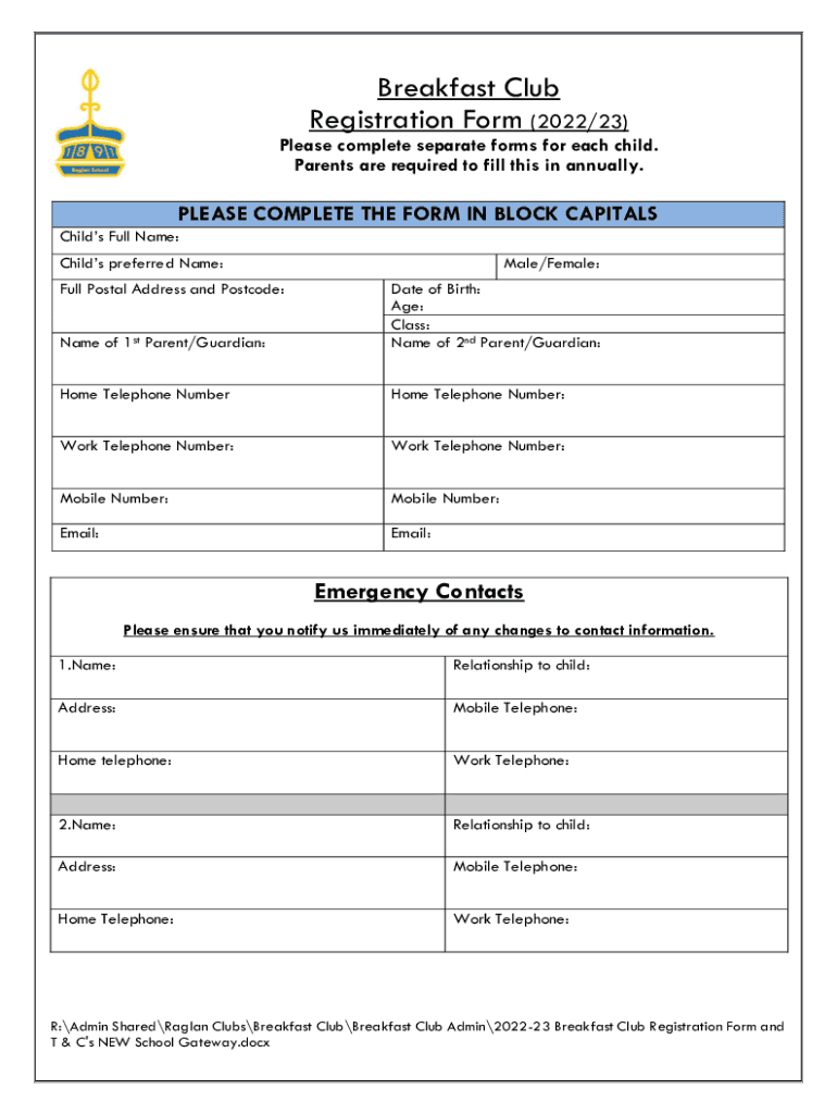 Breakfast Club Registration Form (2022/23) Please complete separate forms for each child. Parents are required to fill this in annually. PLEASE COMPLETE THE FORM IN BLOCK CAPITALS Child's Full Name: