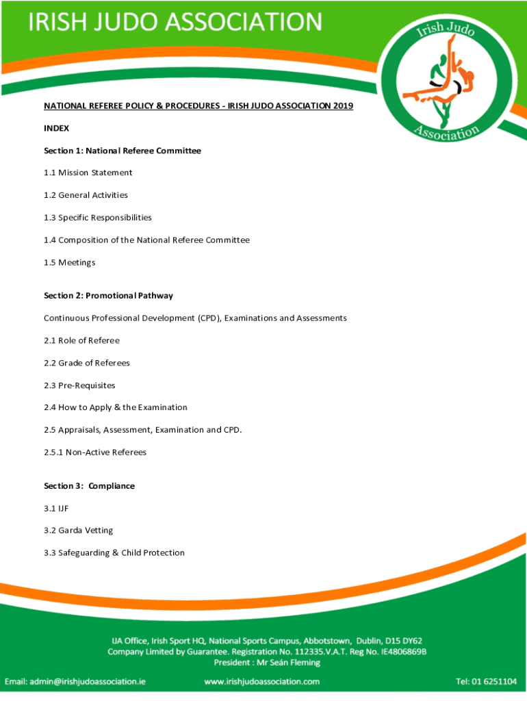NATIONAL REFEREE POLICY & PROCEDURES IRISH JUDO ASSOCIATION 2019 INDEX Section 1: National Referee Committee 1.1 Mission Statement 1.2 General Activities 1.3 Specific Responsibilities 1.4 Composition