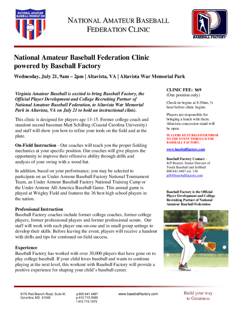 NATIONAL AMATEUR BASEBALL FEDERATION CLINICNational Amateur Baseball Federation Clinic powered by Baseball Factory Wednesday, July 21, 9am 2pm | Alta vista, VA | Alta vista War Memorial Park Virginia