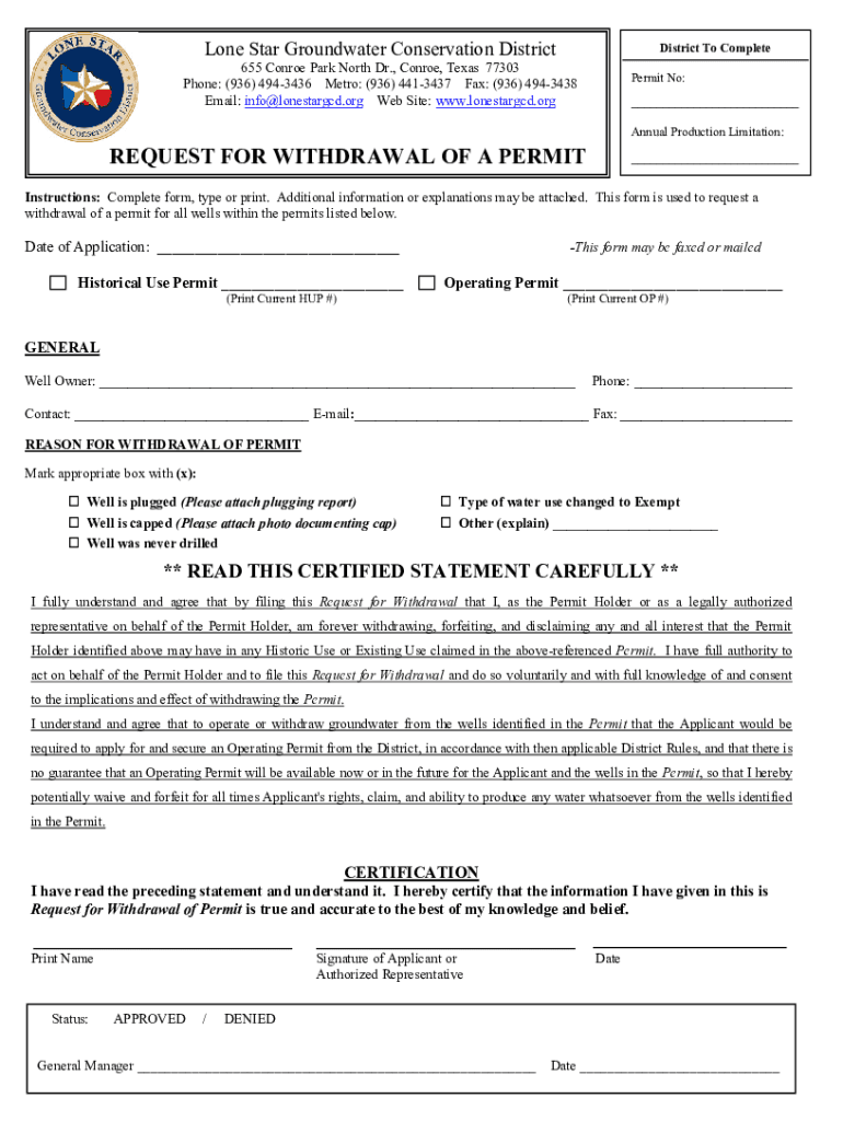 Lone Star Groundwater Conservation DistrictDistrict To Complete655 Conroe Park North Dr., Conroe, Texas 77303 Phone: (936) 4943436 Metro: (936) 4413437 Fax: (936) 4943438 Email: info@lonestargcd.org