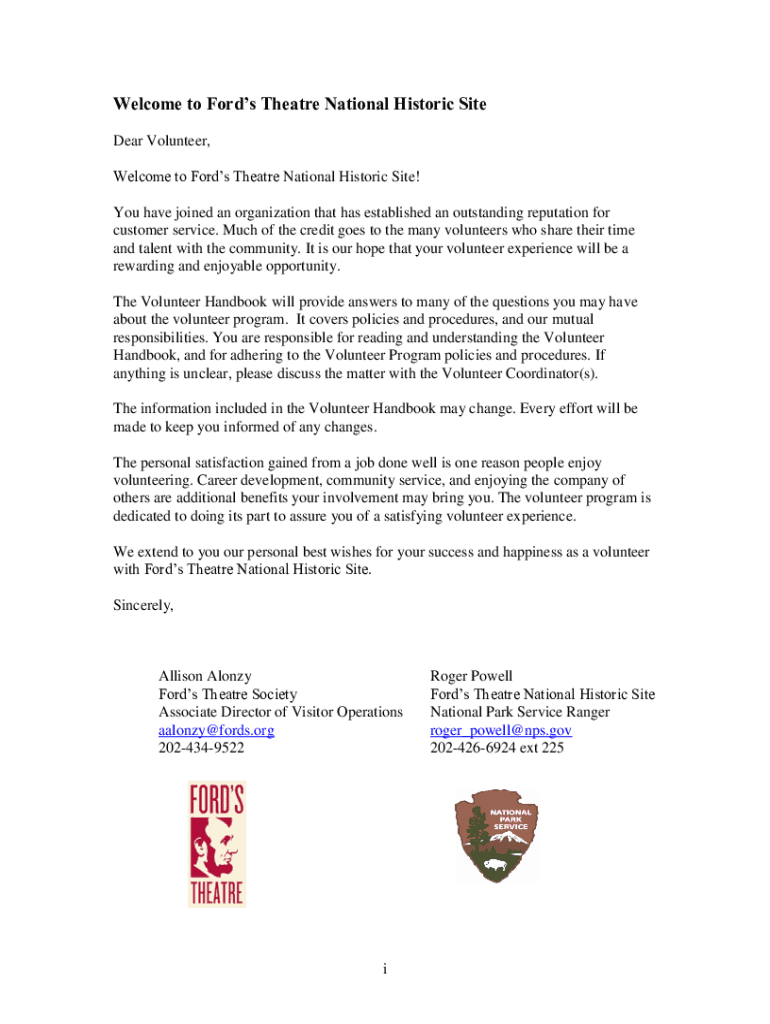 Welcome to Ford Theater National Historic Site Dear Volunteer, Welcome to Fords Theater National Historic Site! You have joined an organization that has established an outstanding reputation for customer
