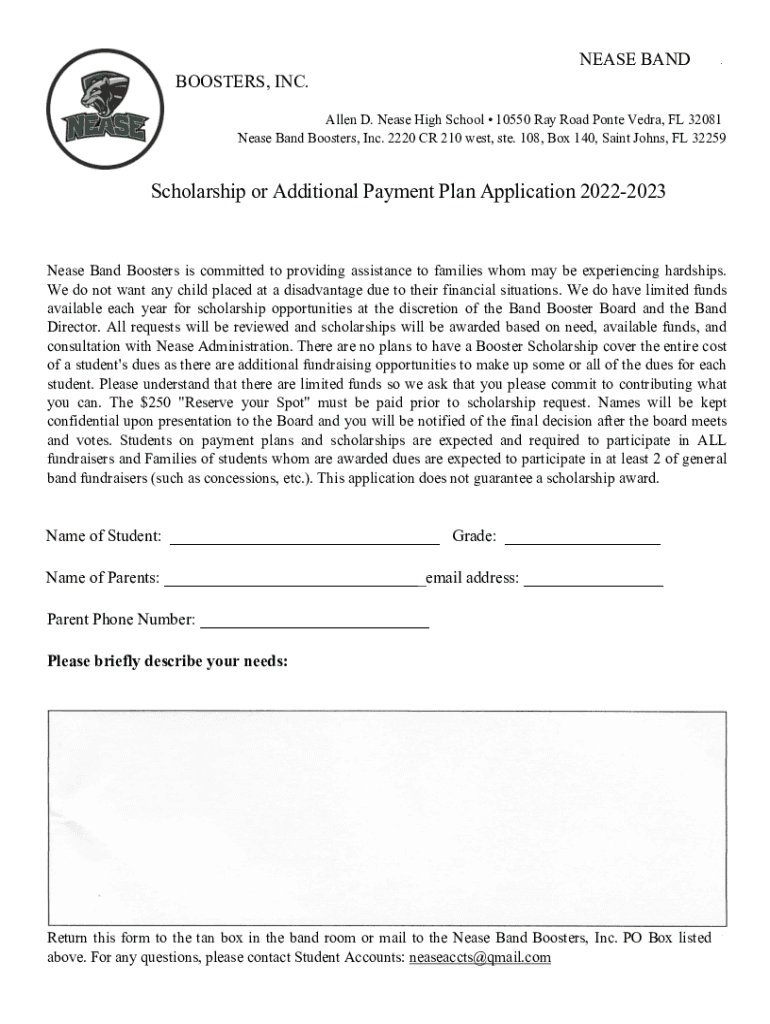 CEASE BAND BOOSTERS, INC. Allen D. Cease High School 10550 Ray Road Monte Veda, FL 32081 Cease Band Boosters, Inc. 2220 CR 210 west, STE. 108, Box 140, Saint Johns, FL 32259Scholarship or Additional
