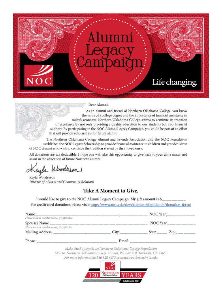 Alumni Legacy Campaign Dear Alumni, As an alumni and friend of Northern Oklahoma College, you know the value of a college degree and the importance of financial assistance in today's economy. Northern