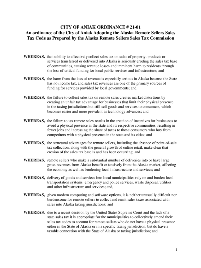 CITY OF ANIA ORDINANCE # 2101 An ordinance of the City of ANIA Adopting the Alaska Remote Sellers Sales Tax Code as Prepared by the Alaska Remote Sellers Sales Tax CommissionWHEREAS, the inability
