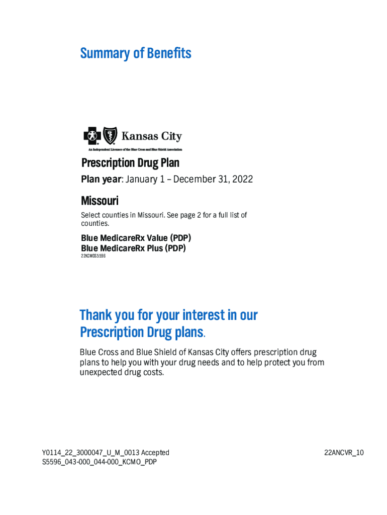 Summary of BenefitsPrescription Drug Plan year: January 1 December 31, 2022Missouri Select counties in Missouri. See page 2 for a full list of counties. Blue Medicare Rx Value (PDP) Blue Medicare