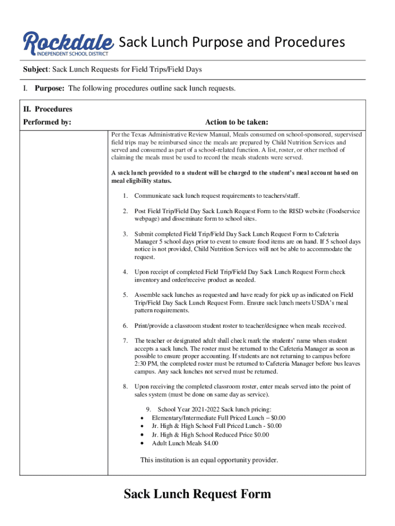Sack Lunch Purpose and Procedures Subject: Sack Lunch Requests for Field Trips/Field Days I. Purpose: The following procedures outline sack lunch requests. II. Procedures Performed by:Action to be