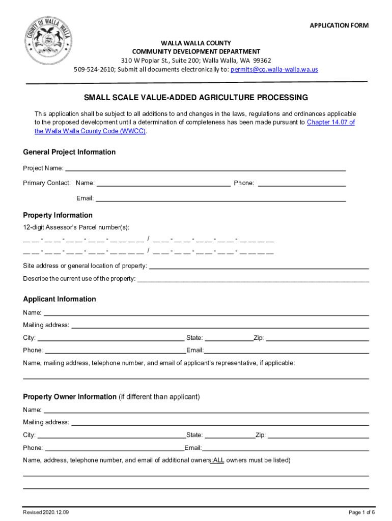 APPLICATION FORM WALL COUNTY COMMUNITY DEVELOPMENT DEPARTMENT 310 W Poplar St., Suite 200; Wall, WA 99362 5095242610; Submit all documents electronically to: permits@co.wallawalla.wa.usSMALL SCALE