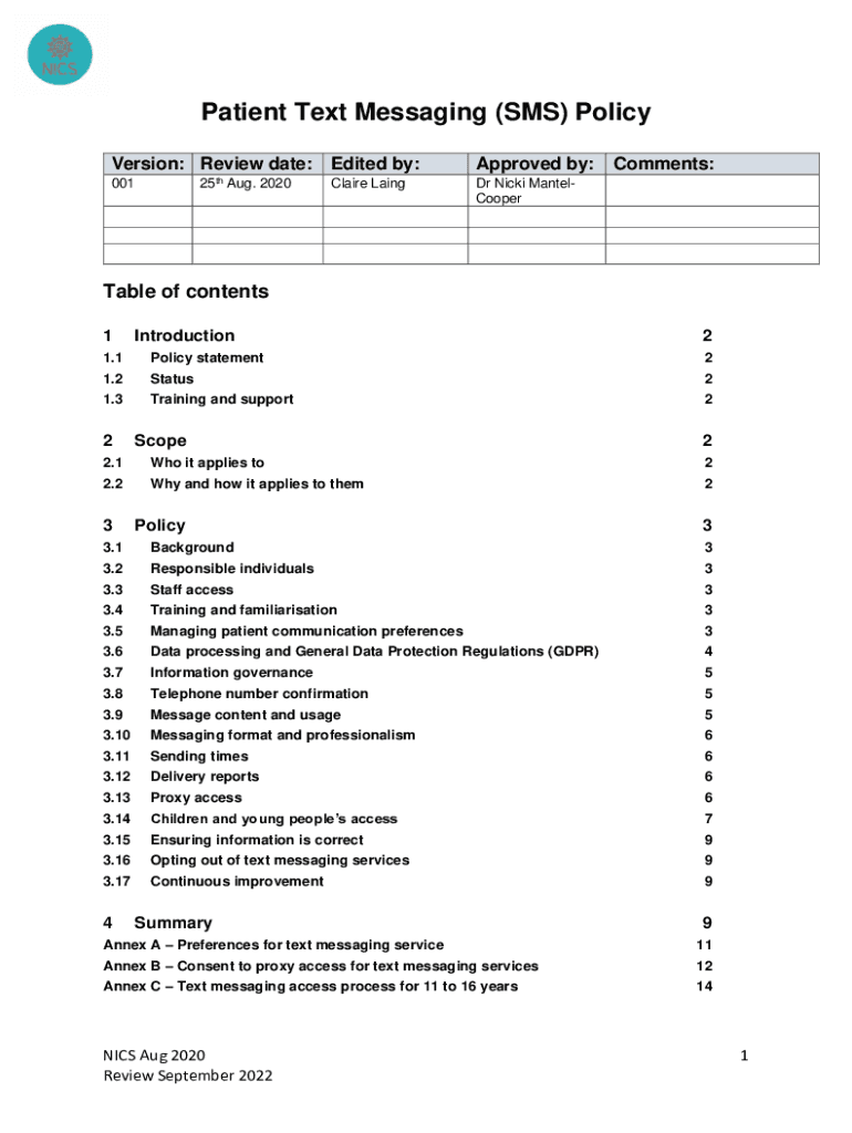 Patient Text Messaging (SMS) Policy Version: Review date: 25th Aug. 2020001Edited by:Approved by:Claire Linger Nicki MantelCooperComments:Table of contents 1Introduction21.1Policy statement21.2Status21.3Training