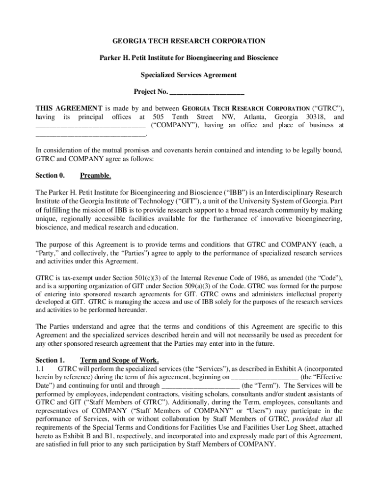 GEORGIA TECH RESEARCH CORPORATION Parker H. Petite Institute for Bioengineering and Bioscience Specialized Services Agreement Project No. ___ THIS AGREEMENT is made by and between GEORGIA TECH RESEARCH