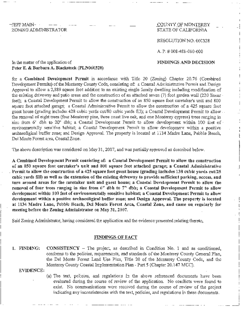 JEFF MAIN ZONING ADMINISTRATORCOUNTY OF MONTEREY STATE OF CALIFORNIA RESOLUTION NO. 060328 A. P. # 00848101000 0In the matter of the application o f Peter E. & Barbara A. Black stock (PLN060328)FINDINGS