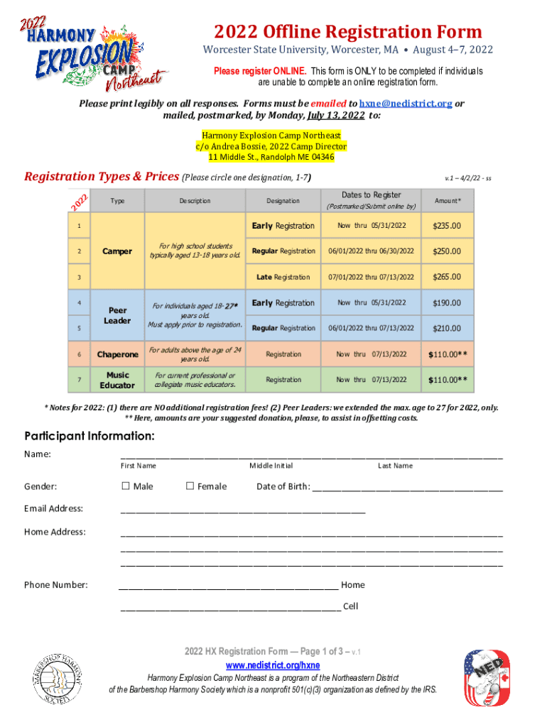 2022 Offline Registration Form Worcester State University, Worcester, MA August 47, 2022 Please register ONLINE. This form is ONLY to be completed if individuals are unable to complete an online registration