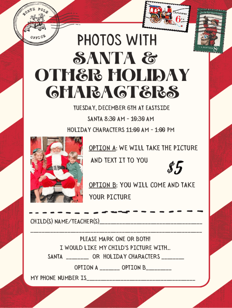 NORTH POLEOFFICEPhotos Lithuania & OTHER HOLIDAY CHARACTERS TUESDAY, DECEMBER 6TH AT EASTSIDE SANTA 8:30 AM 10:30 AM HOLIDAY CHARACTERS 11:00 AM 1:00 MOTION A: WEILL Takes THE PICTURE AND TEXT IT