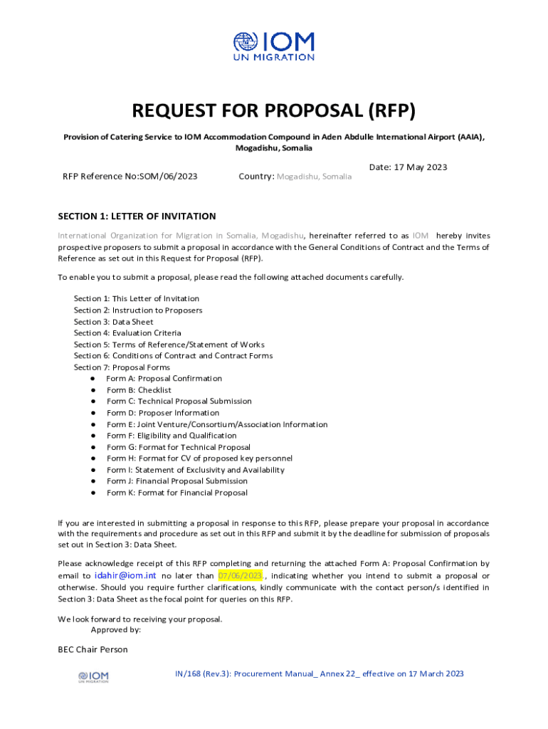 REQUEST FOR PROPOSAL (RFP) Provision of Catering Service to IOM Accommodation Compound in Aden Abdul International Airport (ASIA), Mogadishu, Somalia RFP Reference No:SOME/06/2023Country: Mogadishu,