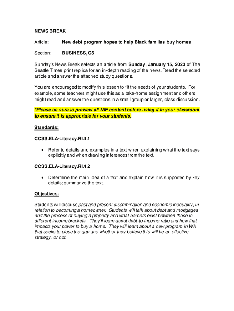 NEWS BREAK Article:New debt program hopes to help Black families buy homesSection:BUSINESS, C5Sunday\'s News Break selects an article from Sunday, January 15, 2023, of The Seattle Times print replica