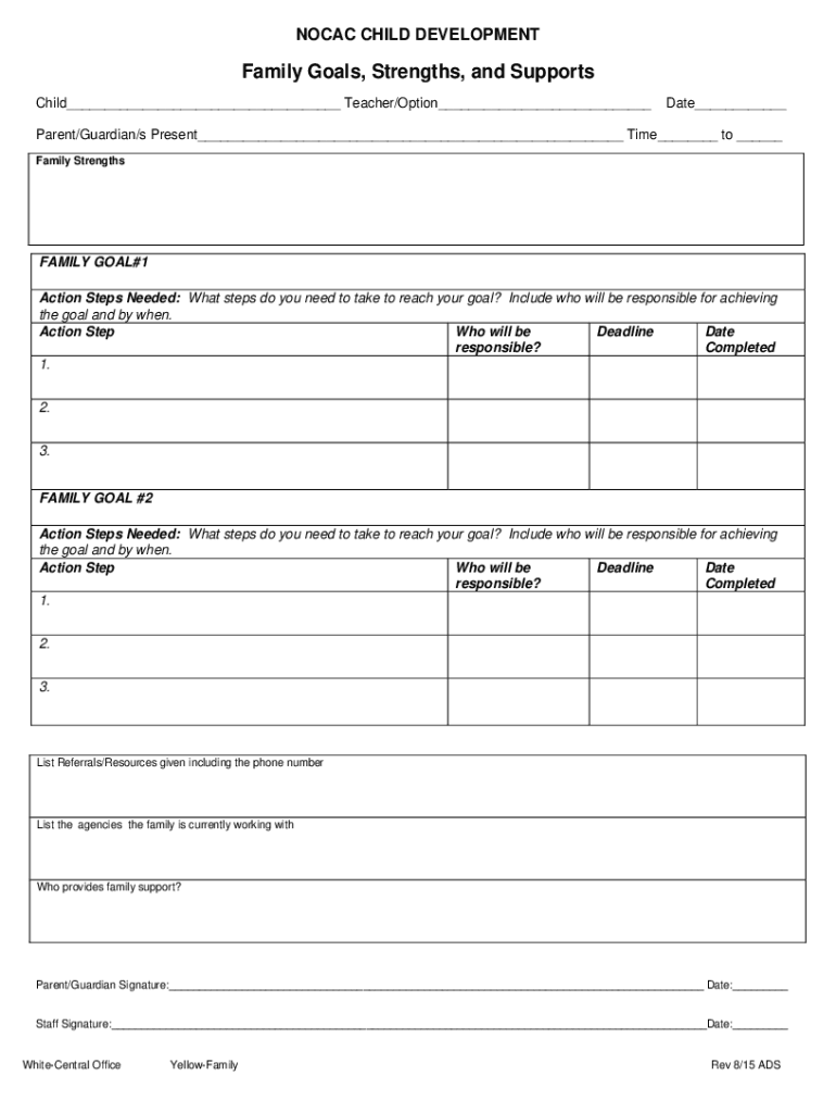 NO CAC CHILD Developmentally Goals, Strengths, and Supports Child___ Teacher/Option___Date___Parent/Guardian/s Present___ Time___ to ___ Family StrengthsFAMILY GOAL#1 Action Steps Needed: What steps