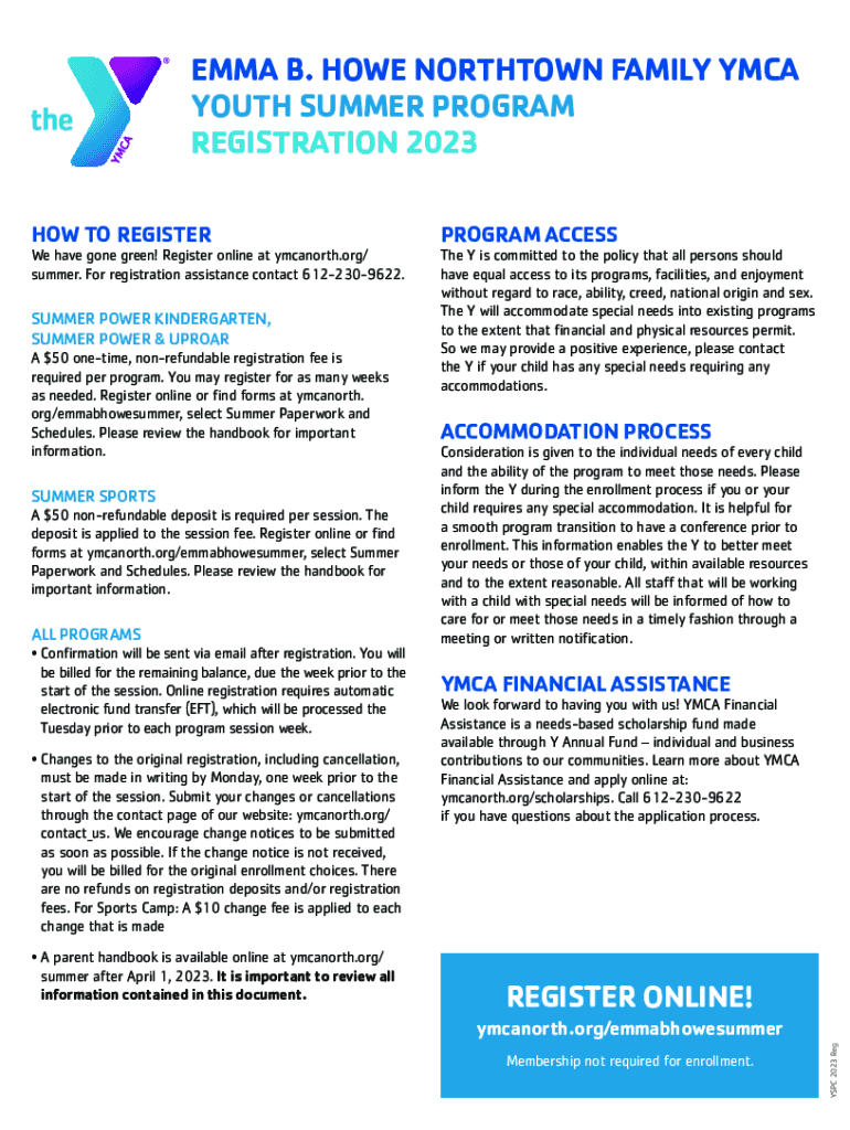 EMMA B. HOWE NORTHERN FAMILY YMCA YOUTH SUMMER PROGRAM REGISTRATION 2023We have gone green! Register online at ymcanorth.org/ summer. For registration assistance contact 6122309622.SUMMER POWER KINDERGARTEN,