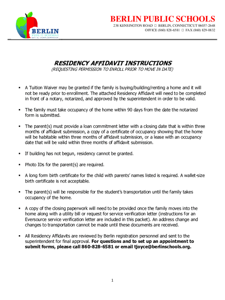 BERLIN PUBLIC SCHOOLS238 KENSINGTON ROAD BERLIN, CONNECTICUT 060372648 OFFICE (860) 8286581 FAX (860) 8290832RESIDENCY AFFIDAVIT INSTRUCTIONS(REQUESTING PERMISSION TO ENROLL PRIOR TO MOVE IN DATE)A