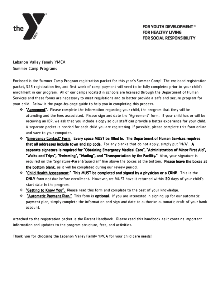 Lebanon Valley Family YMCA Summer Camp Programs Enclosed is the Summer Camp Program registration packet for this year's Summer Camp! The enclosed registration packet, $25 registration fee, and first