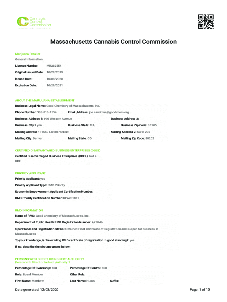 Massachusetts Cannabis Control Commission Marijuana Retailer General Information: License Number:MR282554Original Issued Date: 10/29/2019 Issued Date:10/08/2020Expiration Date:10/29/2021ABOUT THE