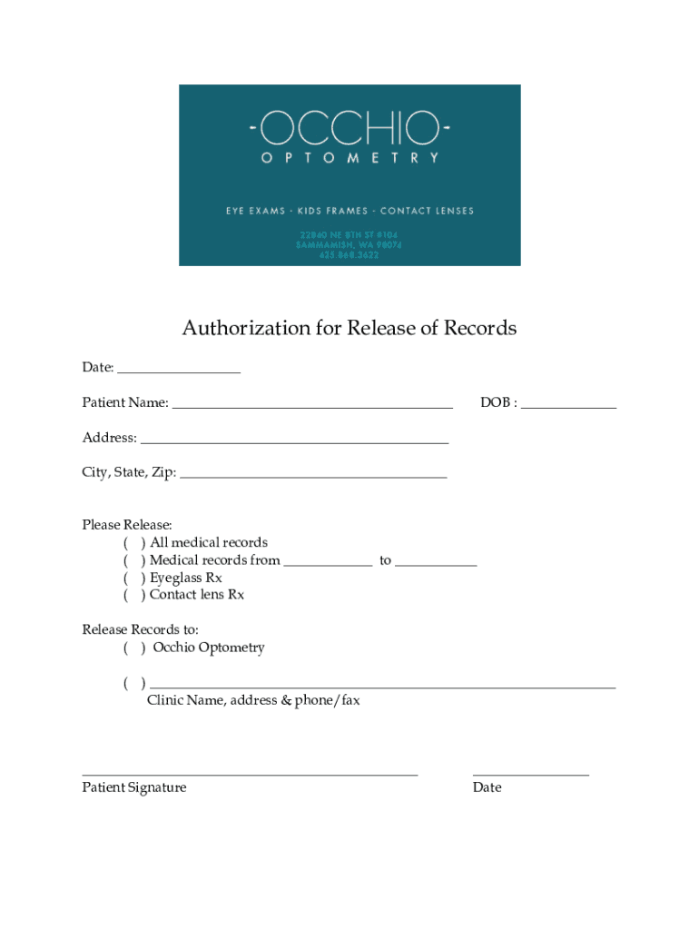 Authorization for Release of Records Date: ___ Patient Name: ___DOB : ___Address: ___ City, State, Zip: ___Please Release: () All medical records () Medical records from ___ to ___ () Eyeglass Rx
