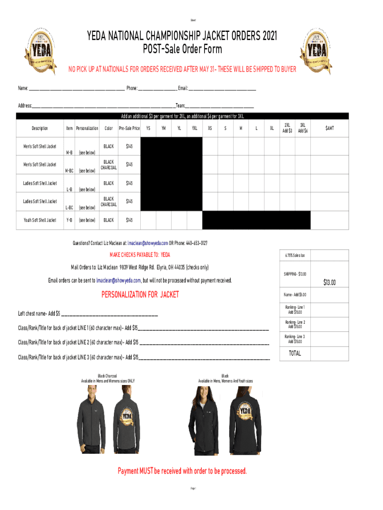 Sheet1YEDA NATIONAL CHAMPIONSHIP JACKET ORDERS 2021 POSTS ale Order Form NO PICK UP AT NATIONALS FOR ORDERS RECEIVED AFTER MAY 31 THESE WILL BE SHIPPED TO BUYER Name: ___ Phone: ___ Email: ___ Address:___Team:___