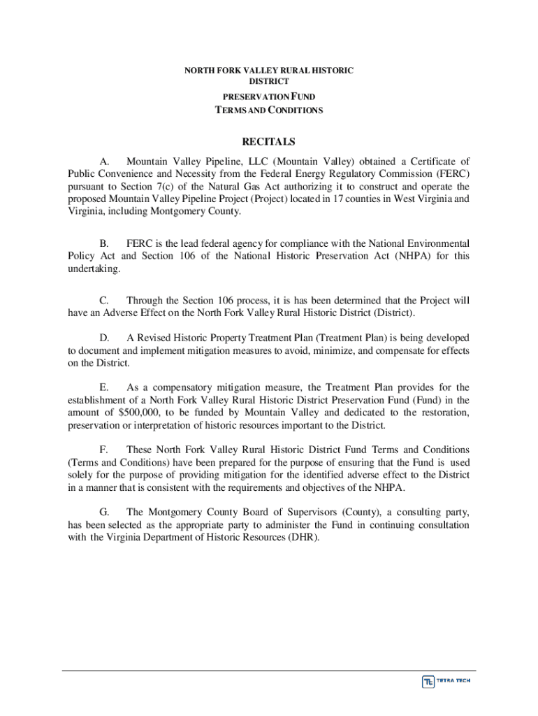 NORTH FORK VALLEY RURAL HISTORIC DISTRICT PRESERVATION FUNDERS AND CONDITIONS RECITALS A. Mountain Valley Pipeline, LLC (Mountain Valley) obtained a Certificate of Public Convenience and Necessity