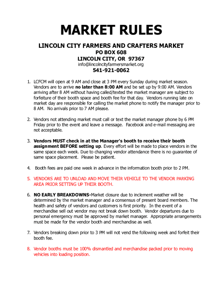 MARKET RULES LINCOLN CITY FARMERS AND CRATERS MARKET PO BOX 608 LINCOLN CITY, OR 97367 info@lincolncityfarmersmarket.org5419210062 1. CFCM will open at 9 AM and close at 3 PM every Sunday during market