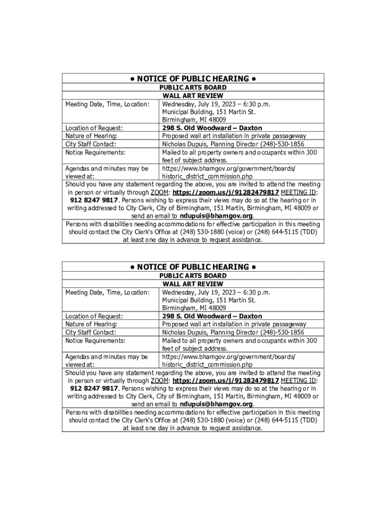 NOTICE OF PUBLIC HEARING PUBLIC ARTS BOARD WALL ART REVIEW Meeting Date, Time, Location: Wednesday, July 19, 2023 6:30 p.m. Municipal Building, 151 Martin St. Birmingham, MI 48009 Location of Request: