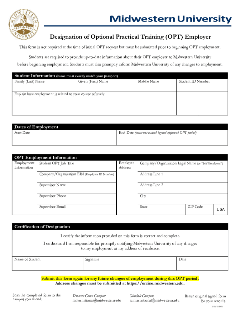 Midwestern University Designation of Optional Practical Training (OPT) Employer This form is not required at the time of initial OPT request but must be submitted prior to beginning OPT employment.