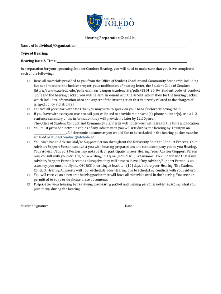 Hearing Preparation Checklist Name of Individual/Organization: ___ Type of Hearing: ___ Hearing Date & Time: ___ In preparation for your upcoming Student Conduct Hearing, you will need to make sure