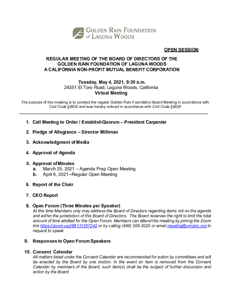 OPEN SESSION REGULAR MEETING OF THE BOARD OF DIRECTORS OF THE GOLDEN RAIN FOUNDATION OF LAGUNA WOODS A CALIFORNIA NONPROFIT MUTUAL BENEFIT CORPORATION Tuesday, May 4, 2021, 9:30 a.m. 24351 El Too