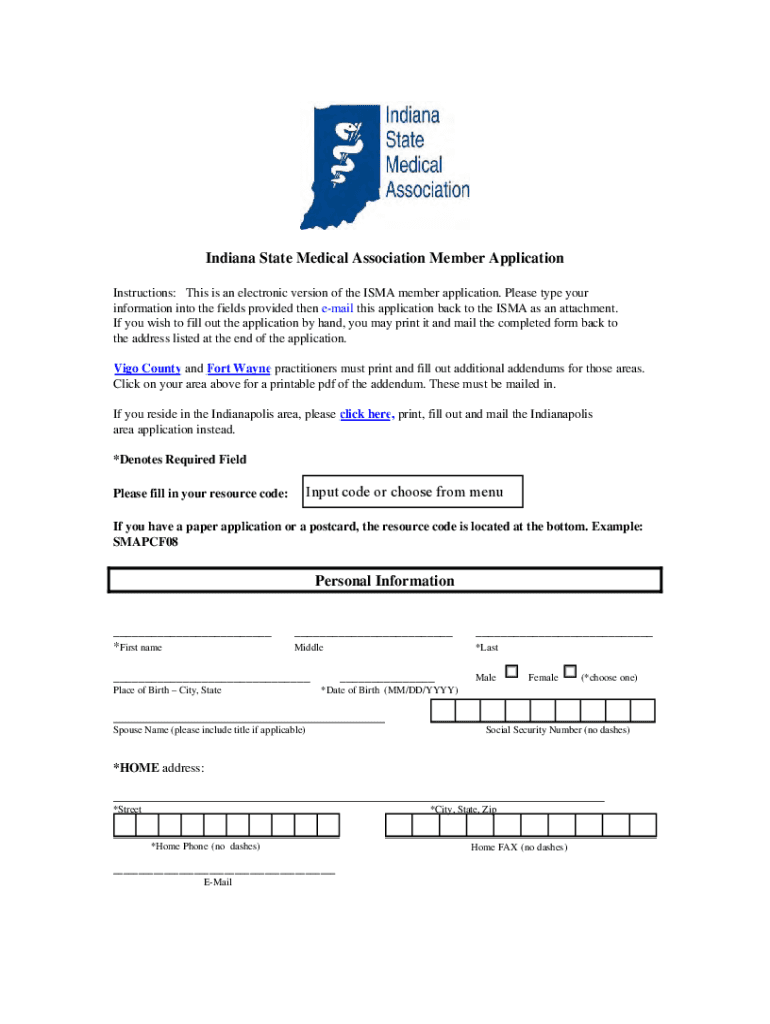 Indiana State Medical Association Member Application Instructions: This is an electronic version of the IMA member application. Please type your information into the fields provided then email this