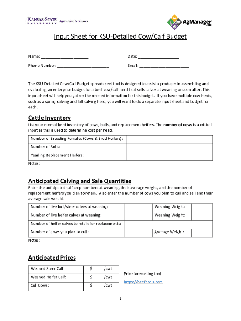Input Sheet for Detailed Cow/Calf Budget Name: ___Date: ___Phone Number: ___Email: ___The Detailed Cow/Calf Budget spreadsheet tool is designed to assist a producer in assembling and evaluating an