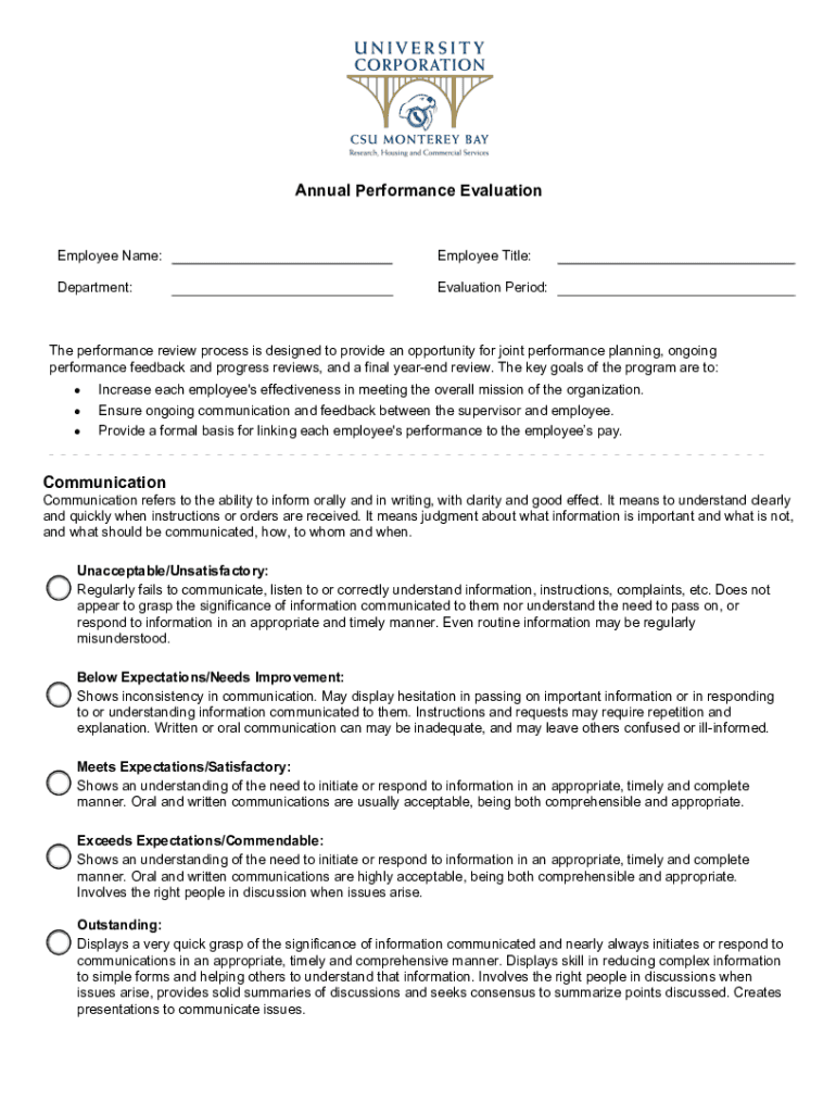 Annual Performance EvaluationEmployee Name:Employee Title:Department:Evaluation Period:The performance review process is designed to provide an opportunity for joint performance planning, ongoing