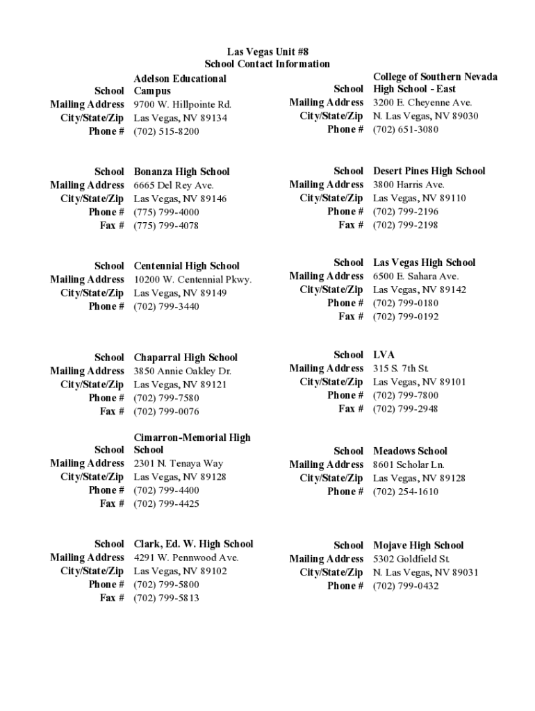 School Mailing Address City/State/Zip Phone #Las Vegas Unit #8 School Contact Information Abelson Educational School Campus Mailing Address 9700 W. Ballpoint Rd. City/State/Zip Las Vegas, NV 89134