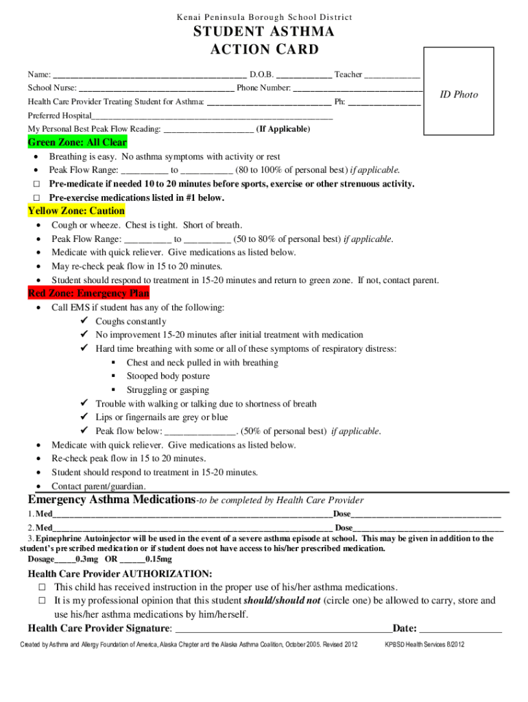 KE Na i P e NI n s u la B o RO u g h Sc ho o l D i STR IC ts STUDENT A ASTHMA A ACTION C ARD Name: ___ D.O.B. ___ Teacher ___ School Nurse: ___ Phone Number: ___ Health Care Provider Treating Student