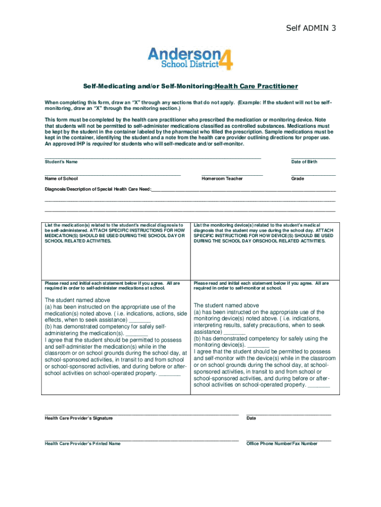 Self ADMIN 3SelfMedicating and/or Telemonitoring:Health Care Practitioner When completing this form, draw an X through any sections that do not apply. (Example: If the student will not be self monitoring,