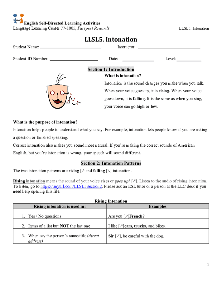 English Self-directed Learning Activities Language Learning Center 771005, Passport RewardsLLSL5. IntonationLLSL5. Intonation Student Name:Instructor:Student ID Number:Date:Level:Section 1: IntroductionWhat