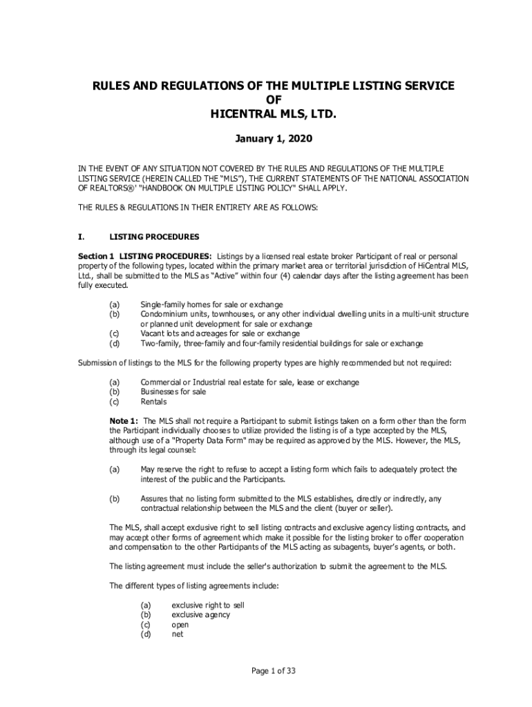 RULES AND REGULATIONS OF THE MULTIPLE LISTING SERVICE OF CENTRAL MLS, LTD. January 1, 2020, IN THE EVENT OF ANY SITUATION NOT COVERED BY THE RULES AND REGULATIONS OF THE MULTIPLE LISTING SERVICE (HEREIN