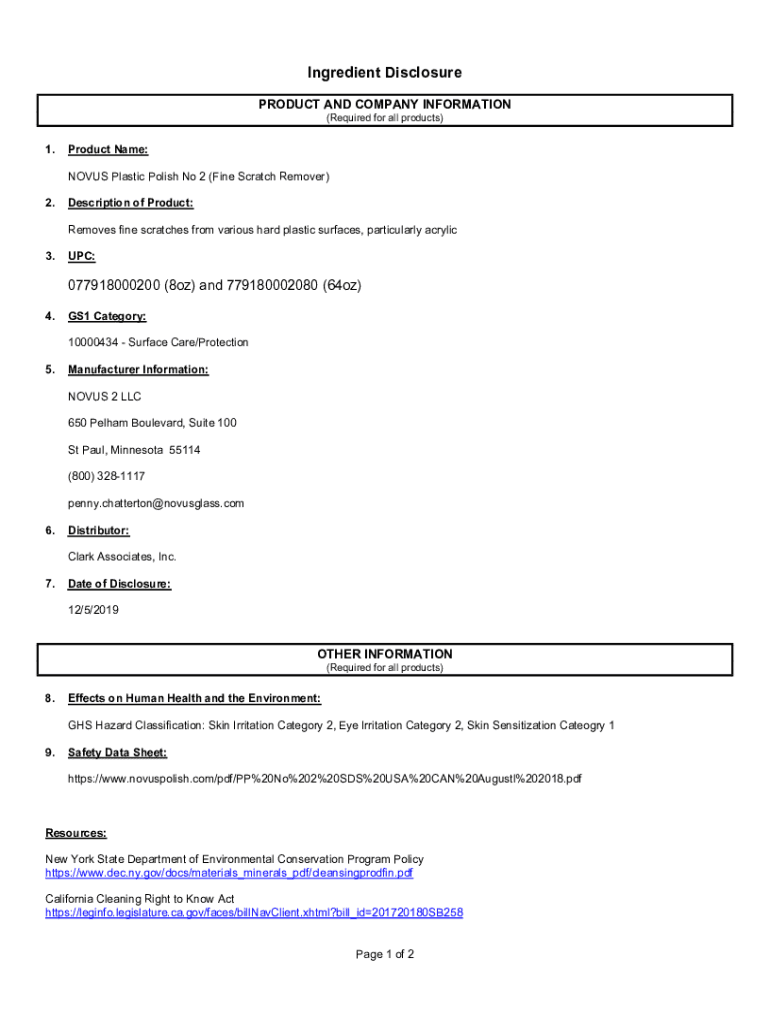 Ingredient Disclosure PRODUCT AND COMPANY INFORMATION (Required for all products)1. Product Name: NOUS Plastic Polish No 2 (Fine Scratch Remover)2. Description of Product: Removes fine scratches from