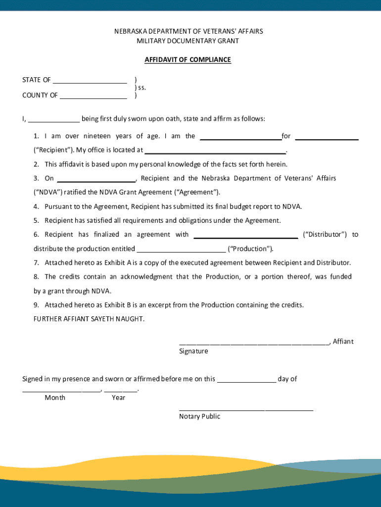 NEBRASKA DEPARTMENT OF VETERANS\' AFFAIRS MILITARY DOCUMENTARY GRANT AFFIDAVIT OF COMPLIANCE STATE OF ___)) SS. COUNTY OF ___) I, ___ being first duly sworn upon oath, state and affirm as follows:1.