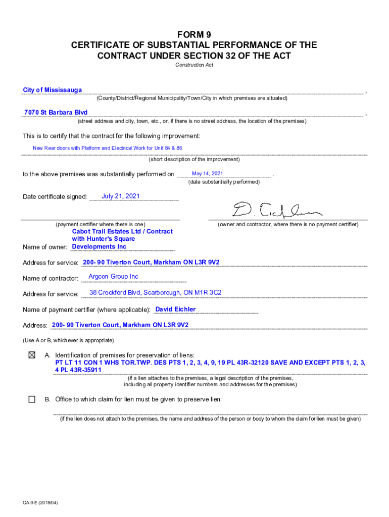 FORM 9 CERTIFICATE OF SUBSTANTIAL PERFORMANCE OF THE CONTRACT UNDER SECTION 32 OF THE ACT Construction Activity of Mississauga, (County/District/Regional Municipality/Town/City in which premises are