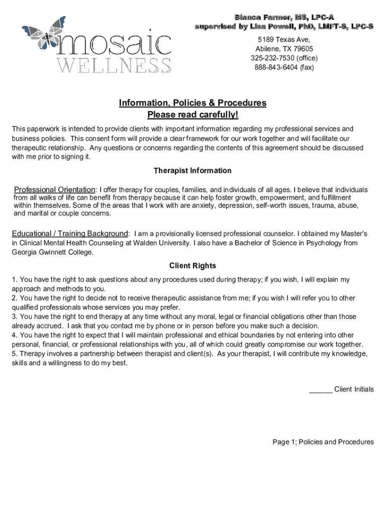 Bianca Farmer, MS, SPCA supervised by Lisa Powell, PhD, LIFTS, PCs 5189 Texas Ave, Abilene, TX 79605 3252327530 (office) 8888436404 (fax)Information, Policies & Procedures Please read carefully! This