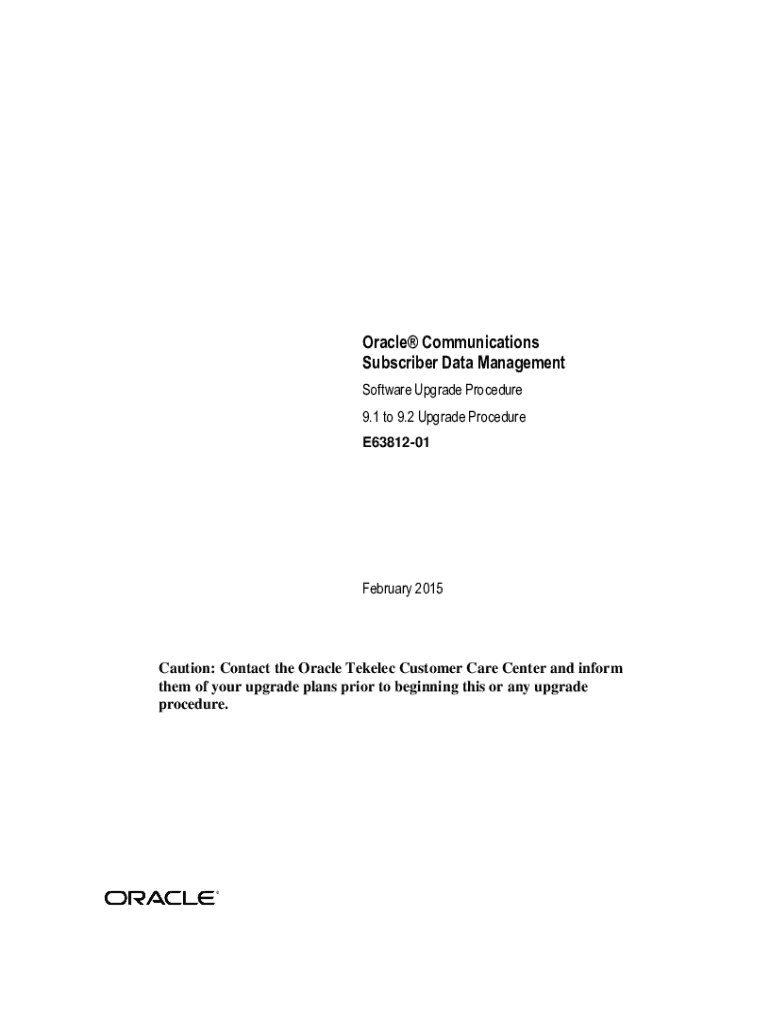Oracle Communications Subscriber Data Management Software Upgrade Procedure 9.1 to 9.2 Upgrade Procedure E6381201February 2015Caution: Contact the Oracle Temple Customer Care Center and inform them