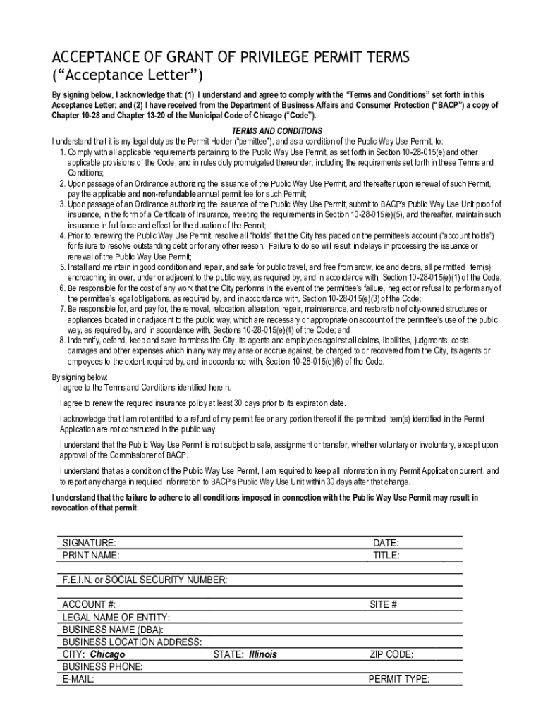 ACCEPTANCE OF GRANT OF PRIVILEGE PERMIT TERMS (Acceptance Letter) By signing below, I acknowledge that: (1) I understand and agree to comply with the Terms and Conditions set forth in this Acceptance