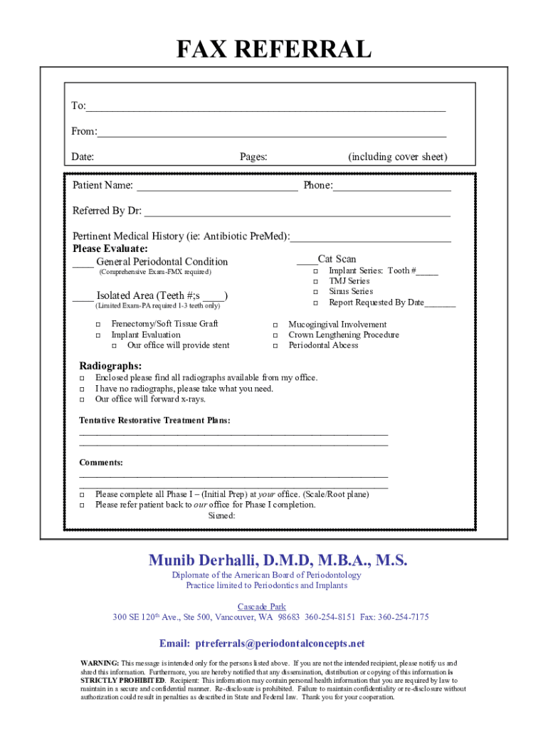 FAX REFERRAL To:___ From:___ Date:Pages:(including cover sheet)Patient Name: ___ Phone:___ Referred By Dr: ___ Pertinent Medical History (i.e.: Antibiotic PreMed):___ Please Evaluate: ___Cat Scan