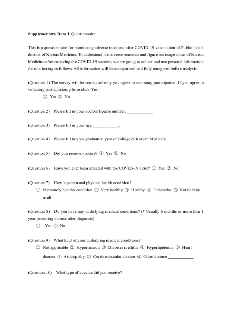 Supplementary Data 1. Questionnaire This is a questionnaire for monitoring adverse reactions after COVID-19 vaccination of Public health doctors of Korean Medicine. To understand the adverse reactions